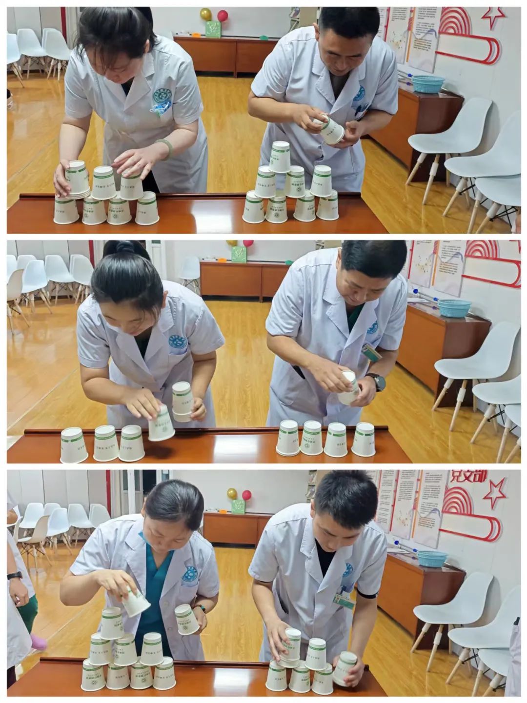“竞技叠杯”同样充满挑战,医师们分为2组,每组3人,每组10个纸杯,要先叠成4+3+2+1的形状,之后再恢复原样,直至最后一人完成。大家争分夺秒,动作麻利,用时最短的小组成功斩获实用奖品。这些趣味活动不仅让医师们在忙碌的工作之余放松了身心,更增强了团队的凝聚力。